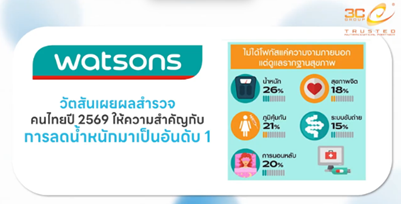 จากการสำรวจเทรนด์สุขภาพที่จะเกิดขึ้นในปี 2569 โดย "วัตสัน" (Watsons) ผู้นำตลาดสุขภาพและความงาม ได้เปิดเผยข้อมูลที่น่าสนใจว่าสิ่งที่คนไทยให้ความสำคัญเป็นอันดับ 1 คือความต้องการที่จะประสบความสำเร็จในการลดน้ำหนักและควบคุมรูปร่างแต่นั่นไม่ใช่เรื่องง่ายในยุคปัจจุบันที่เต็มไปด้วยของอร่อยและวิถีชีวิตที่เร่งรีบ