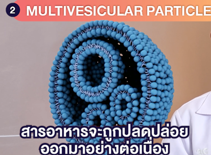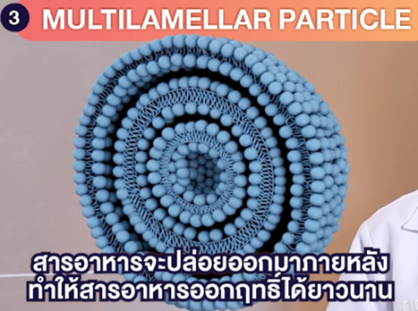 3.อนุภาค Multilamellar Particle จะมีโครงสร้างเปลือกห่อหุ้มหลายชั้น ซึ่งจะปลดปล่อยสารอาหารออกมาในภายหลังสุด ทำให้เกิดการออกฤทธิ์ของสารอาหารอย่างยาวนาน