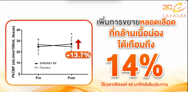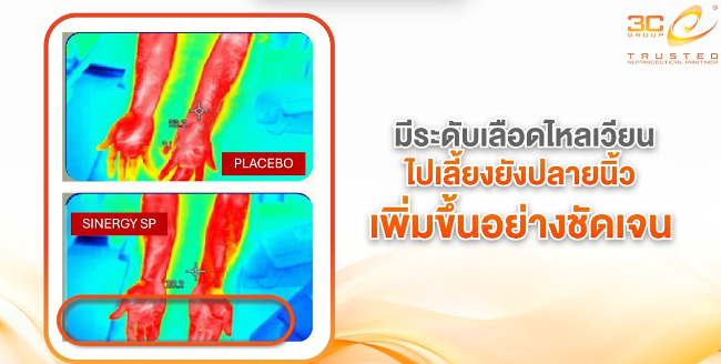 • งานวิจัยรองรับ: การศึกษาทางคลินิกพบว่า เพียงรับประทาน Synergy SP 1 กรัม สามารถเพิ่มการขยายตัวของหลอดเลือดที่กล้ามเนื้อน่องได้ถึง 14% ภายใน 40 นาที! และจากการตรวจด้วยกล้องอินฟราเรด ก็พบว่าการไหลเวียนเลือดไปที่ปลายนิ้วเพิ่มขึ้นอย่างชัดเจน