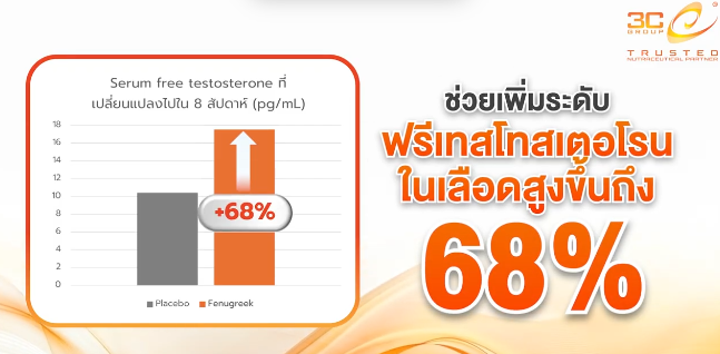 • Fenugreek Extract: มีงานวิจัยพบว่า หลังรับประทานต่อเนื่อง 12 สัปดาห์ ช่วยเพิ่มระดับ Free Testosterone ในเลือดได้สูงถึง 68%