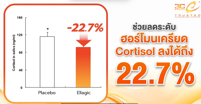จัดการ "ความเครียด" อีกหนึ่งตัวการร้าย นอกจากสาเหตุทางกายแล้ว สาเหตุทางใจอย่าง "ความเครียดจากการทำงาน" ก็ทำให้สมรรถภาพเสื่อมได้ สารสกัด Pommegic 70 มีงานวิจัยรองรับว่า ในกลุ่มชายที่มีน้ำหนักเกิน การรับประทานอย่างต่อเนื่อง 12 สัปดาห์ สามารถลดระดับ "คอร์ติซอล" (ฮอร์โมนแห่งความเครียด) ลงได้ถึง 22.7%